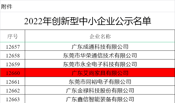 近日廣東省工業(yè)和信息化廳關(guān)于 2022 年創(chuàng)新型中小企業(yè)名單公示,廣東艾尚家具有限公司成功入選!