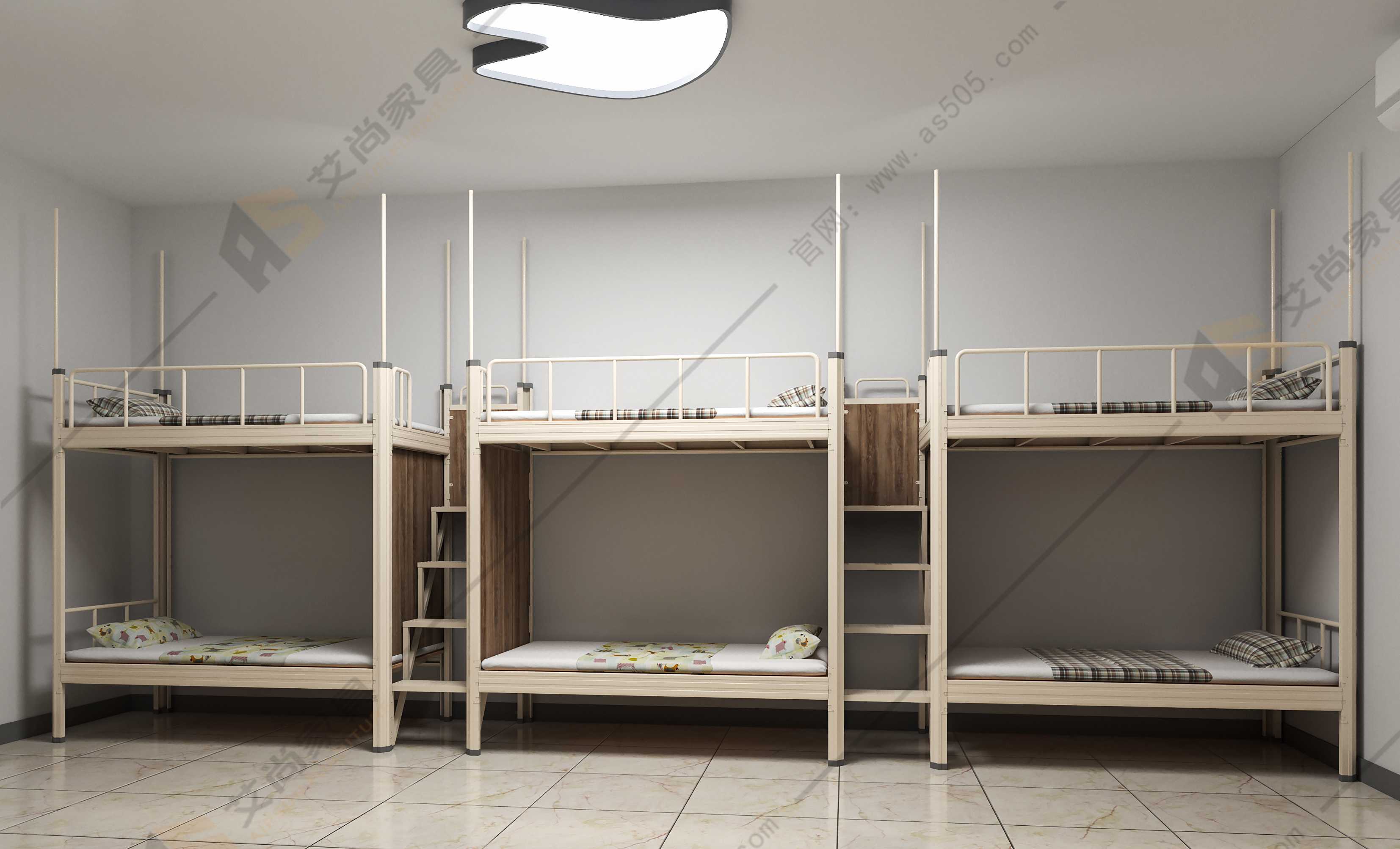 廣東艾尚家具宿舍雙層鐵架床采用冷軋鋼板制作,使用壽命可達10年,線條流暢,穩定性強,每床可承重500kg,結實可靠!全卡扣式結構設計,不需要一顆螺絲,更加安靜、牢固!