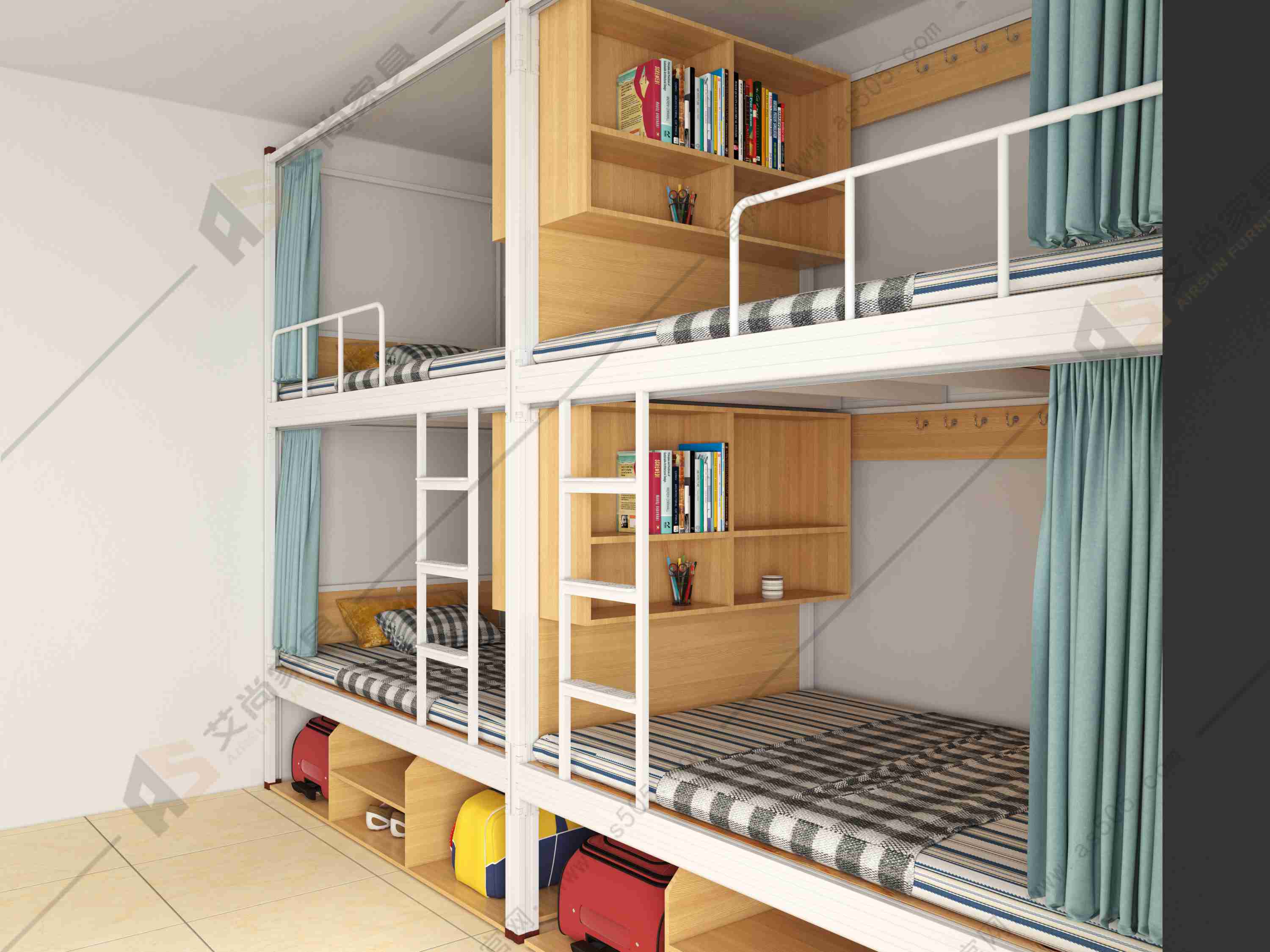 空間利用的最大化:在有限的宿舍空間內,如何最大化地利用上下鋪結構是關鍵。設計時合理利用空間增加功能點,如儲物柜、書架或學習桌等,巧妙地融入床體結構中,既滿足了學生的儲物和學習需求,又節省了空間。同時,上下鋪之間的空間也可以充分利用,設置掛衣桿、儲物籃等,方便學生放置衣物和日常用品。
